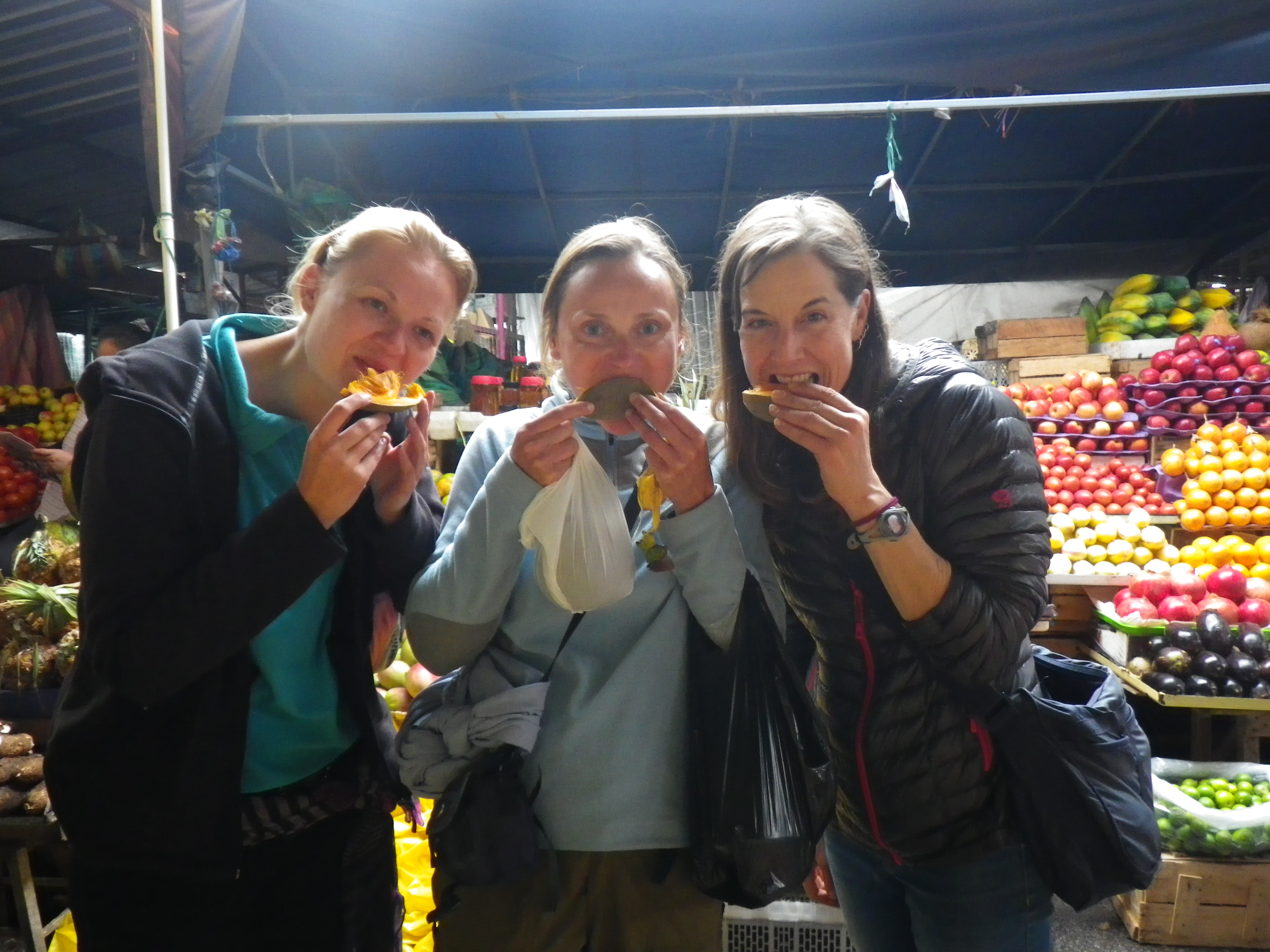 Trying new fruits with Gabriela and Renata at a market in Cuenca.